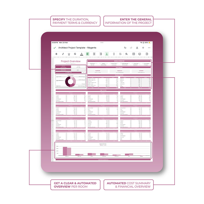 Designed specifically for architects and interior designers, this template helps you organize project costs, track expenses, and stay within budget from concept to completion. With dedicated sections for materials, suppliers, labor, and tasks, you’ll have a clear view of your spending at every stage.